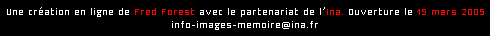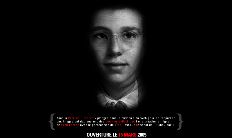 Il s’agissait là à cet emplacement de cette liste d’une installation exceptionnelle crée par Fred Forest à la demande d’Emmanuel Hoog Président de l’Ina, hébergé sur ses serveurs et mise en œuvre par ses développeurs pour marquer la création à l’Ina d’un nouveau service dédié à la création contemporaine. Une création exceptionnelle, car il s’agissait là à notre connaissance de la toute première installation participative en ligne réalisée dans le monde. Elle consistait à considérer le web comme une énorme mémoire collective où chacun, accompagné par un des quatre guides (deux femmes et deux hommes) pouvait se rendre en son centre. Sous leur conduite il était possible pour le visiteur du site de taper un nom sur le clavier pour que soit lancée une recherche sur le web qui après avoir moulinée ramenait 63 réponses. Toutes ces réponses s’inscrivaient dans une configuration carrée.