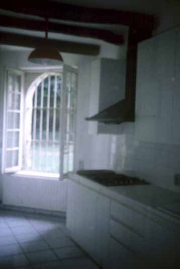 The kitchen with old styled hood and lots of cabinet space.